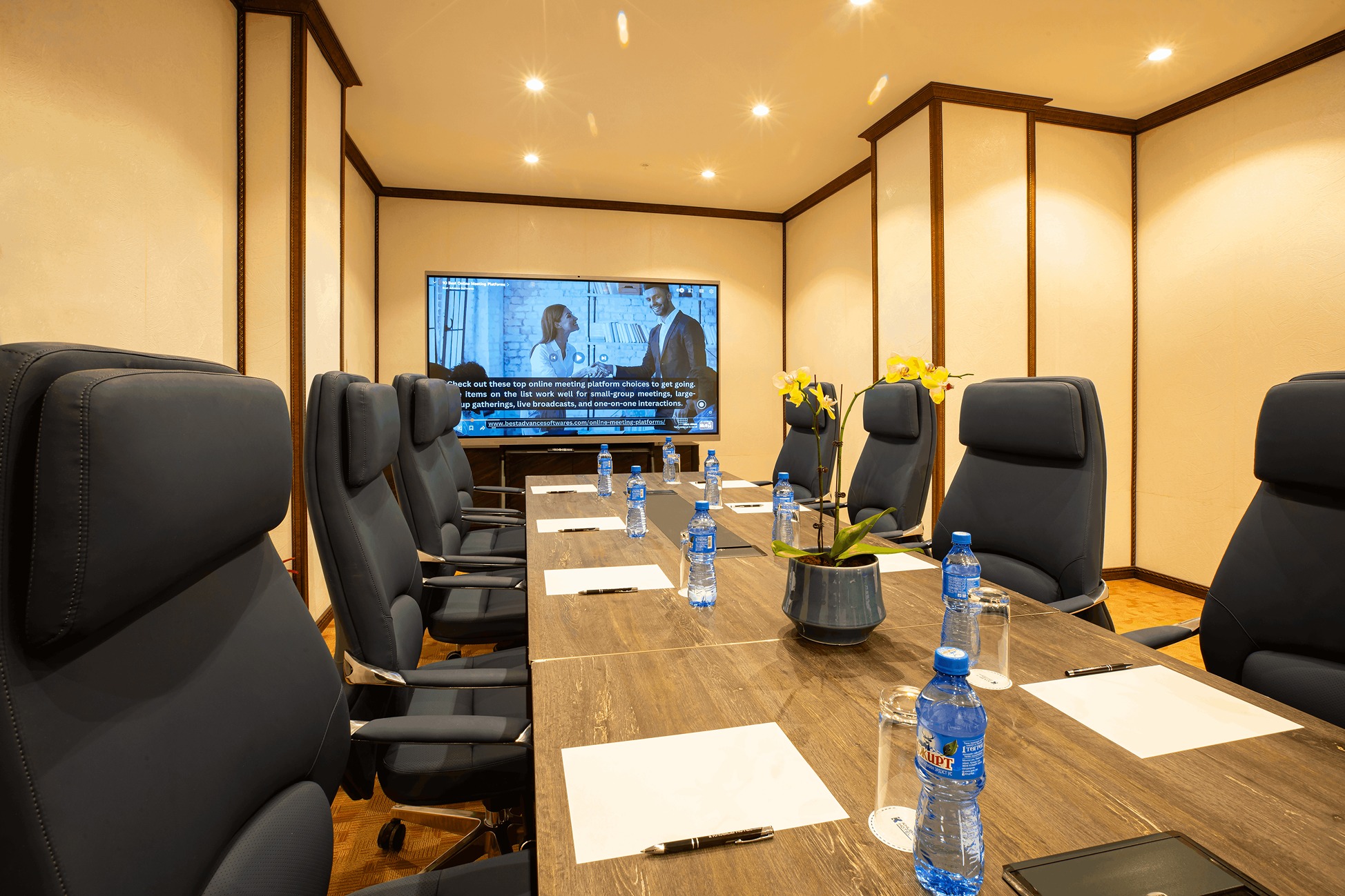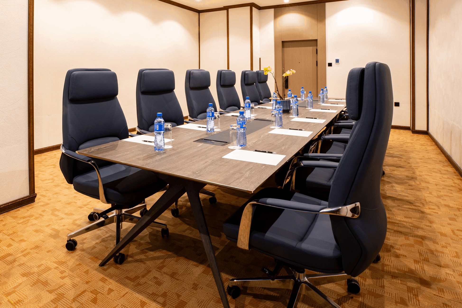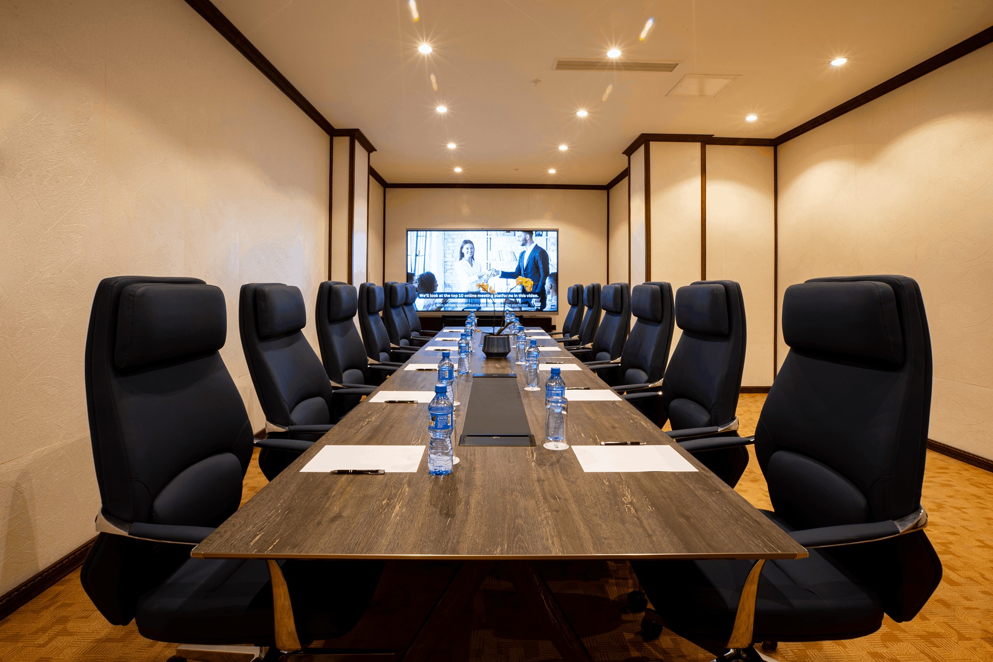 Elegantly furnished with a large executive table, ergonomic seating, and sophisticated décor, the room provides a calm and focused atmosphere ideal for board meetings, client presentations, interviews, or small training sessions.