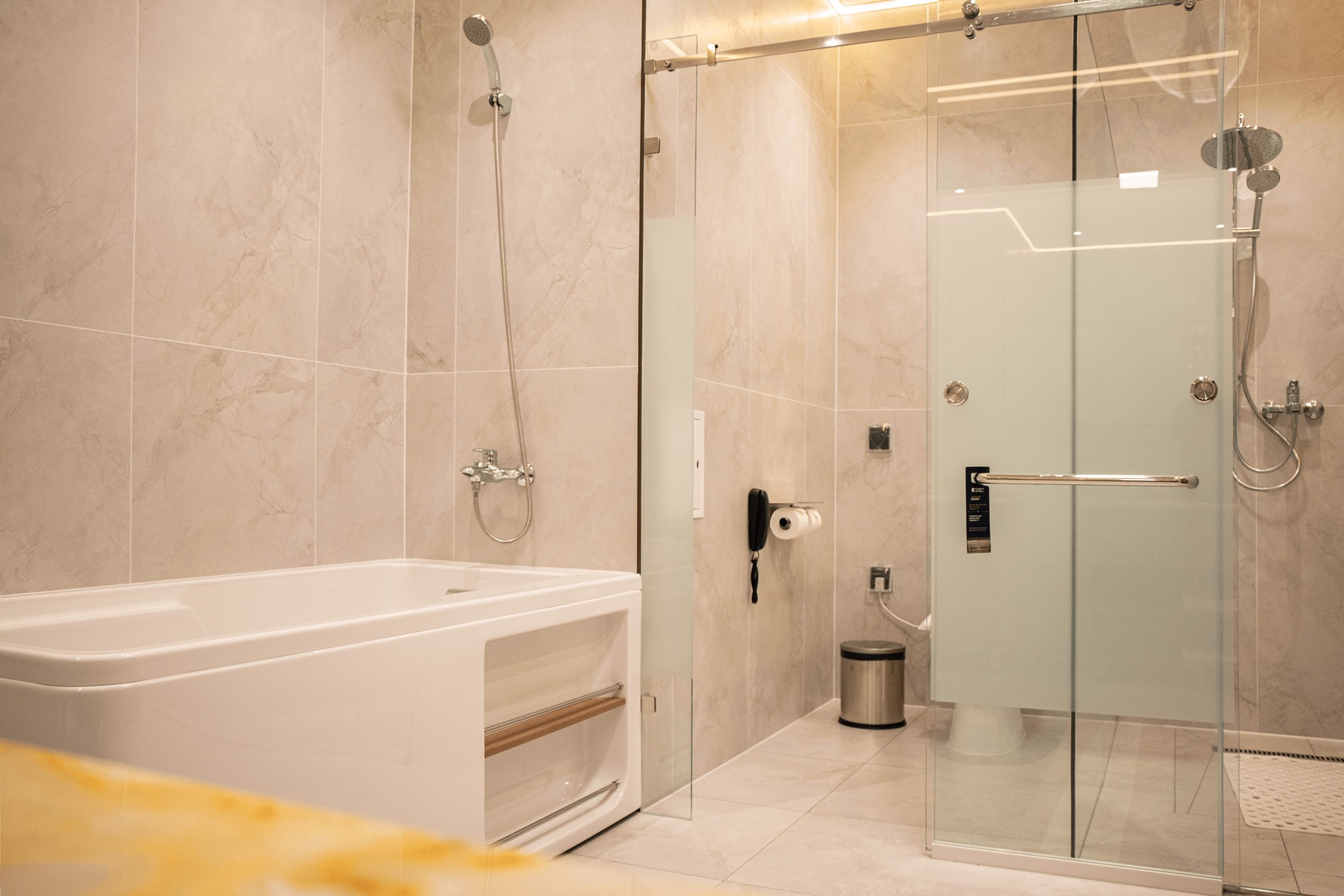 The elegant en-suite bathroom includes a walk-in shower, plush towels, bathrobes, and a selection of premium toiletries—everything you need for a comfortable and refreshing stay.