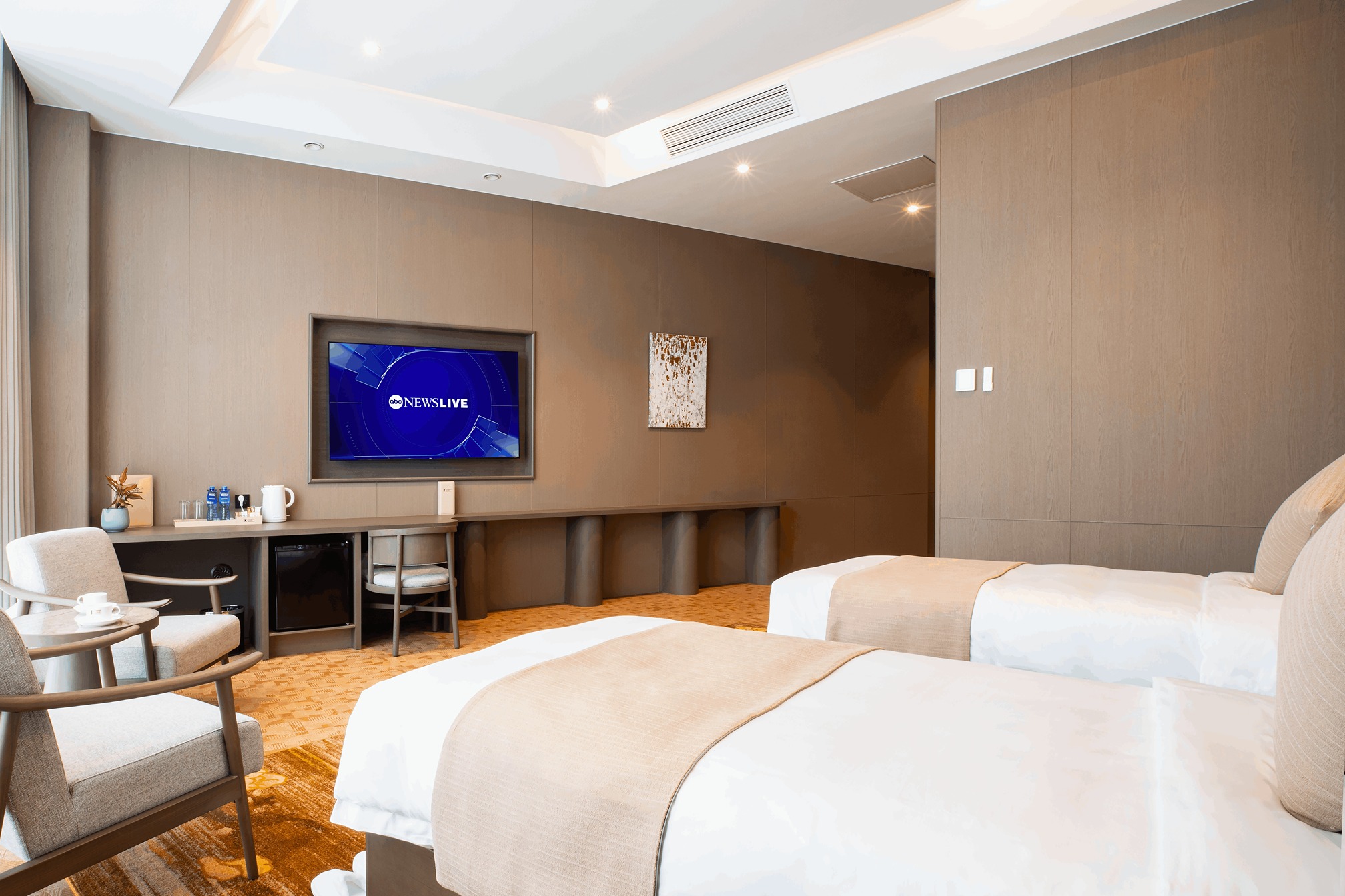 Spacious and thoughtfully appointed, the room includes a flat-screen TV, high-speed Wi-Fi, a functional work desk, and a fully stocked minibar to meet both leisure and business needs. Natural light fills the room through large windows, creating a bright and inviting atmosphere throughout the day.